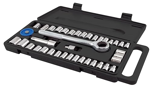 - Includes 3/8" ratchet, extension, adapter, spin disc, and 38 sockets
