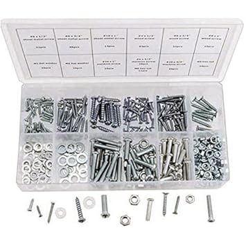 - Essential homeowner assortment - sheet metal & wood screws, machine bolts, hex nuts & flat washers